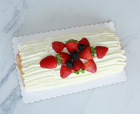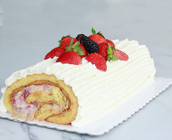 Bizcochuelo húmedo relleno con manjar artesanal y fresas bañado con crema chantilly artesanal.