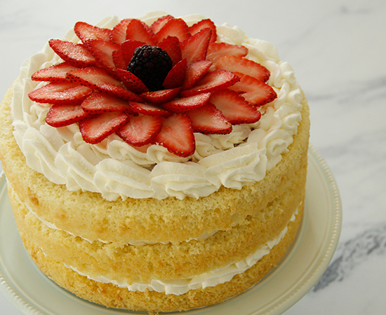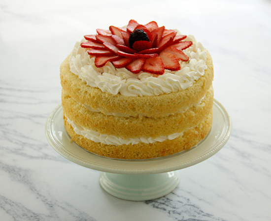 Queque húmedo decorado y relleno con chantilly artesanal y fresas.