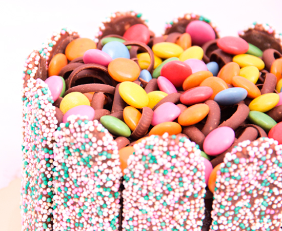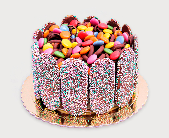 Queque de chocolate húmedo relleno de fugde artesanal decorado con lentejas , virutas de chocolate y doña pepa.