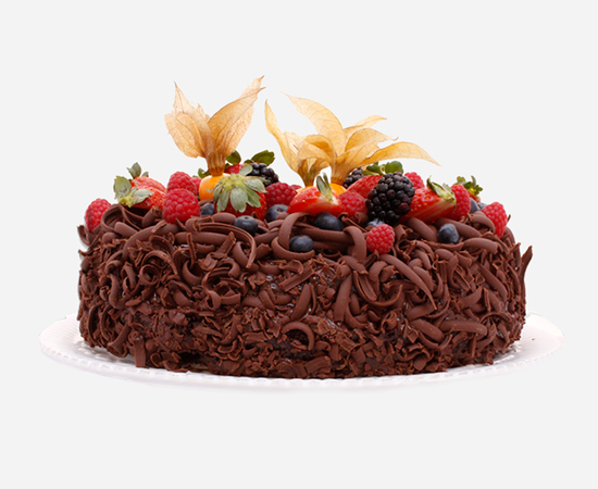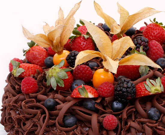 Torta húmeda tradicional de chocolate decorado con arándanos, frambuesas, moras y aguaymanto.
