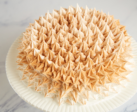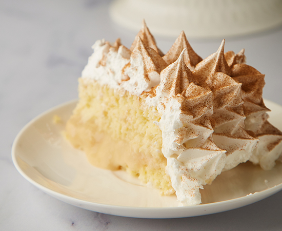 Queque húmedo de vainilla elaborado con tres tipos de leche, relleno de manjar casero, decorado con merengue italiano y canela.